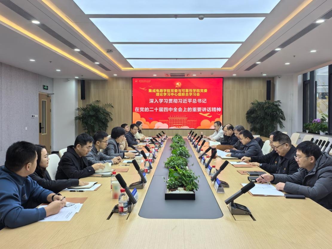 为全面贯彻习近平新时代中国特色社会主义思想和党的二十届四中全会精神,2025年10月29日上午,集成电路学院党委与可靠性学院党委开展理论学习中心组联学活动,深入学习贯彻习近平总书记在党的二十届四中全会上的重要讲话精神, 研讨两院“十五五”规划及深化学科交叉融合等重点工作。会议在第一馆111会议室举行,会议由集成电路学院党委书记高静主持, 两院理论学习中心组成员、一线教师代表参加会议。