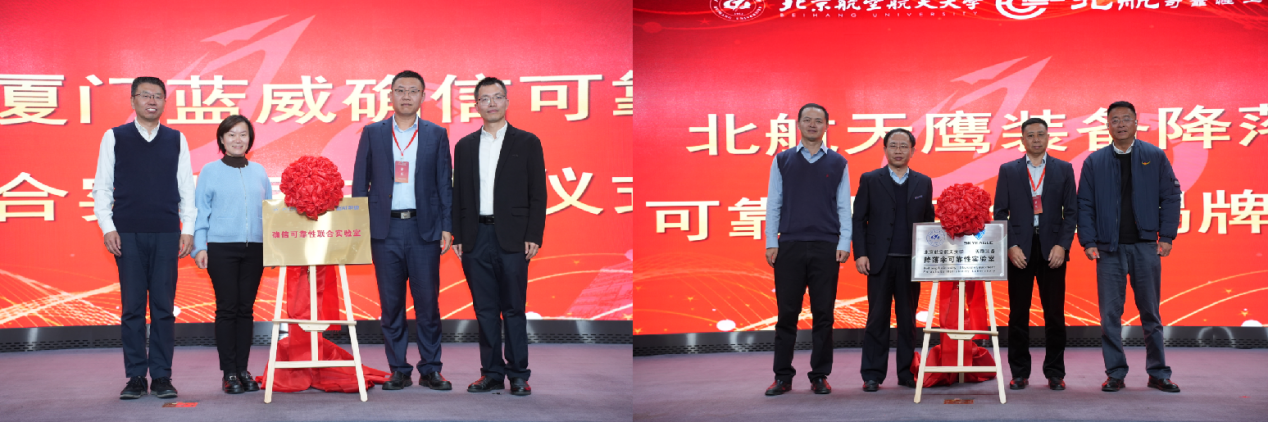联盟年会中,学院和企业代表共同为新联盟框架下成立的校企联合实验室揭牌。学院副院长马小兵、副院长艾骏、章文晋教授、深圳市天鹰装备科技有限公司副总经理张普臣共同为“北航天鹰装备降落伞可靠性实验室”揭牌。学院副院长陈云霞、确信可靠性中心首席科学家康锐,厦门蓝威可靠性系统工程研究院有限公司董事长赵弋飞、总经理阮进喜共同为“北航厦门蓝威确信可靠性联合实验室”揭牌。校企联合实验室将成为校企协同人才培养和技术攻关的重要载体,推动联盟合作产学研用深度融合迈进。