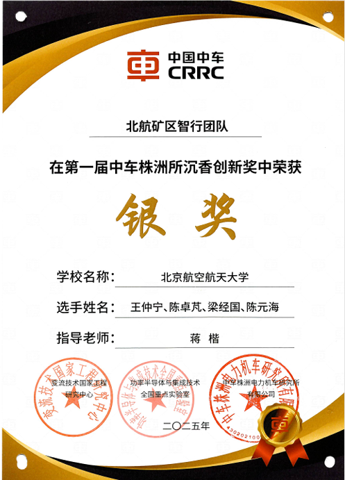 2025年4月,中车株洲电力机车研究所有限公司举办了第五届科技节及第一届沉香创新奖决赛。威廉希尔中国官网智能检测与诊断中心组建的矿区智行团队在全国顶尖高校的激烈竞争中,凭借“矿区智行系统创新项目”荣获沉香创新奖银奖。